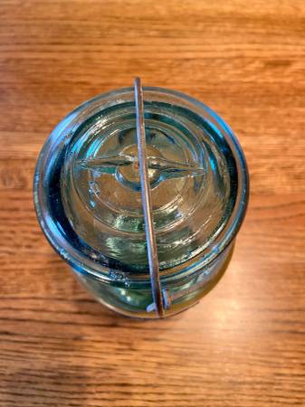 Green BALL Ideal Canning Jar with wire hinges. Reads "Pat'd July 14, 1908". Measures 7 1/2" high x 4" dia. Also # 4 on bottom. Unique and beautiful. $14.00 Clear decanter jar with Mexico City on...