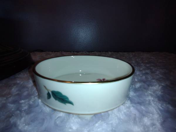 Clean lined 24k gold trim, no wear shown. Adorable pink flower decor on top, front, back and inside.