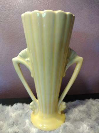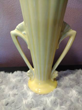 1940's McCoy pastel/pale yellow pottery vase #541, beautiful color shading throughout almost bring it to life with a bit of sass in those arms.