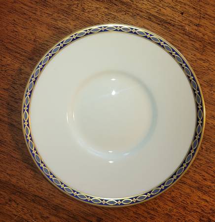 This vintage dinnerware was produced on ivory-coloured porcelain featuring smoky-blue ovals alternating with gold diamond-shapes along a ribbon of cobalt-blue.