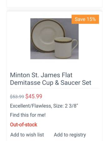 This set of Espresso cup and saucer shows no sign of wear and no chips, cracks or crazing are seen. "Zoom in" to appreciate the lovely condition of this fine dinnerware.
