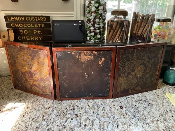 This beautiful wood mirror measures 34 by 11.25 laid out and displays beautifully.