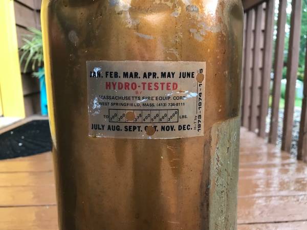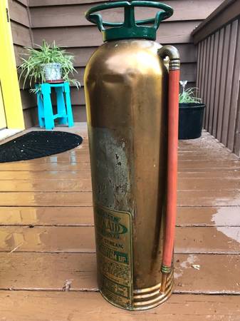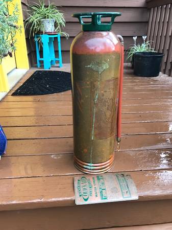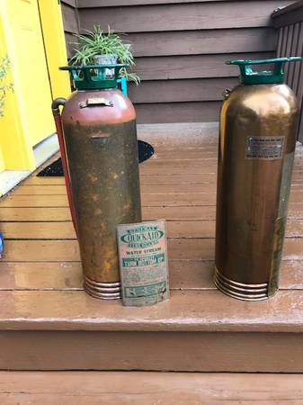 These brass extinguishers (empty) are waiting for someone to change them into lamps at the cabin. Both are in good shape but could use some metal polish to clean further. Age unknown but one has an inspection sticker from the West Springfield MA FD, dated October 1975. Selling them as a pair. Pick up or I will deliver in the metro for an additional $5.