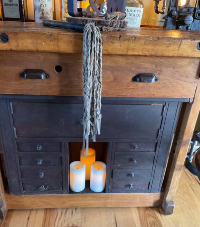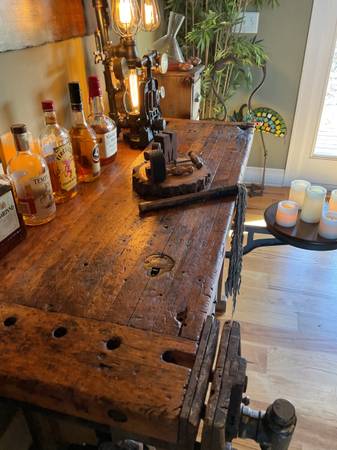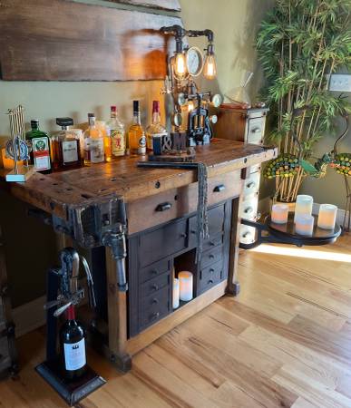 VERY NICE completely restored & refinished, medium sized Carpenter Table workbench sideboard buffet wine/liquor/coffee bar. Functional Morgan front vise, 1 large storage drawer, 8 small storage drawers, 2 large storage doors, & cool swivel seat. This will look absolutely gorgeous in home or office, family room or dining room, she shed or man cave, makes an excellent fun little wine / coffee / liquor bar!