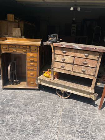 Thinning some of my unfinished inventory, I have WAY too many pieces to work on! These pieces are rough/completely unfinished to not needing a whole lot of work. Vintage jewelers bench with original cast-iron foot pedal wheel to run the polisher, five drawer carpenter table, neat little drafting table with slide out top and hidden door on the side, super heavy, steel slab top mechanics bench.