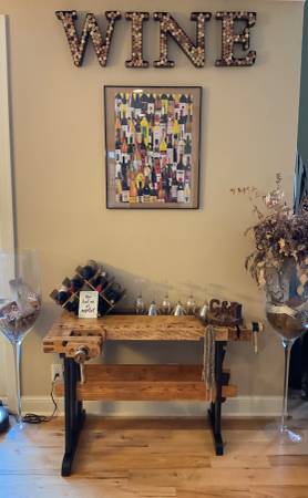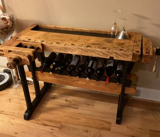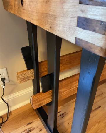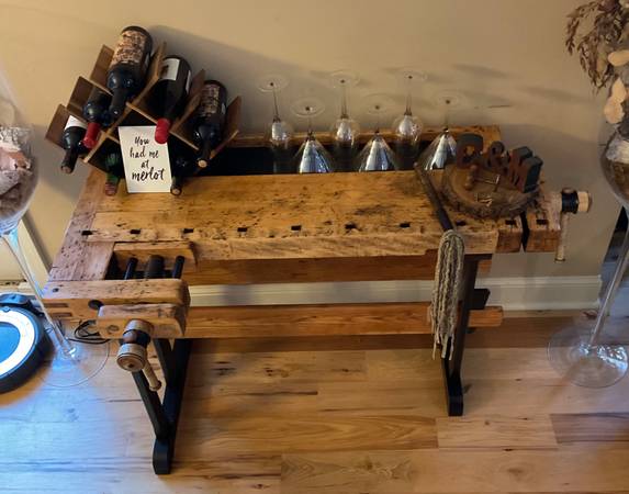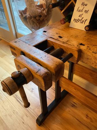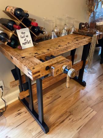 Functional wooden screw shoulder & wooden screw tail vice, beautiful top, super hard to find small size, completely refinished with 2 coats of water resistant satin polyurethane, and trimmed in flat black latex. This will look absolutely gorgeous in home or office, family room or dining room, she shed or man cave, makes an excellent fun little wine /coffee / liquor bar!