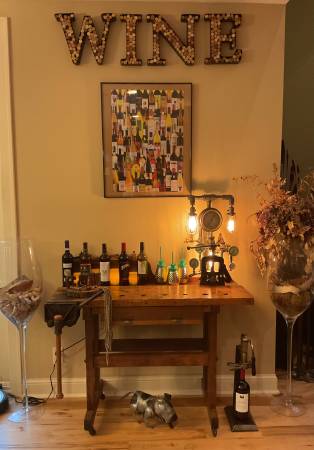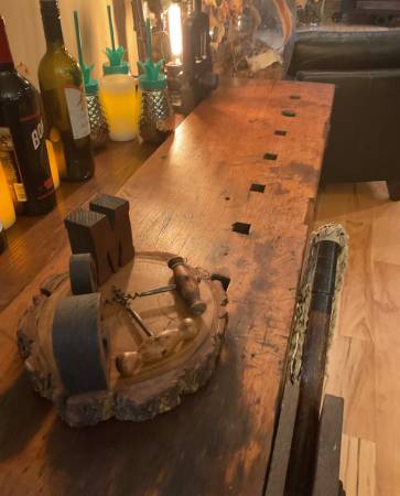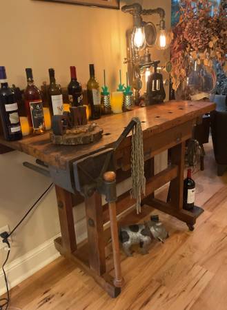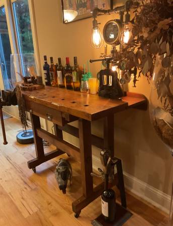 $599 Cash, Venmo, PayPal, or check with proper ID. Delivery available for a small fee. Liquor & decorations not included. Cool old brass gauge & steel pipe lamps sold separately. Click on ‘more ads by this user’ to see my other items, MANY other carpenter tables and slab top farmer workbenches available in different sizes and pricing, finished and unfinished.