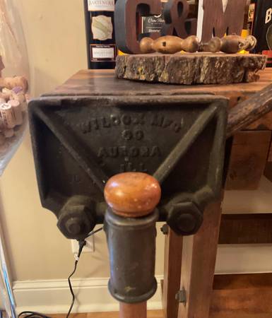 Beautiful 1 3/4” thick top, unique tool (shot glass!) holder in back, large storage drawer, functioning Wilcox quick release vise, this would look fantastic in a man cave, she shed, home entryway, dining room, living room, office, woodshop, it is small AND spectacular!