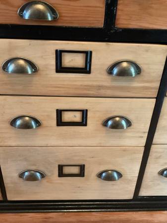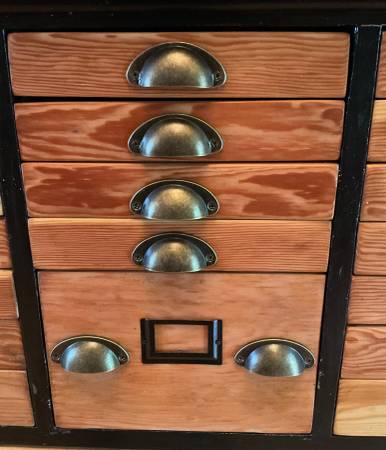 3 upper doors 2 with frosted glass, 7 large storage drawers on the bottom, 18 small drawers in the middle - TONS of flat media storage for your collection. There are several others on marketplace currently in the Midwest, none close to this price, and none completely restored & refinished.