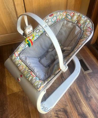 This sleek and modern bouncer is sure to become your baby's favorite place to rest or play. Natural kicks and movements activate the calming bouncing motion that babies love. The optional calming vibrations and soft cozy seat make baby feel safe and comforted. The removable toy bar features a stimulating toy to help entertain your little one when he's ready to play. Seat pad is removable and machine washable.