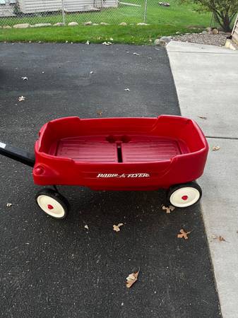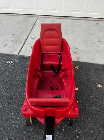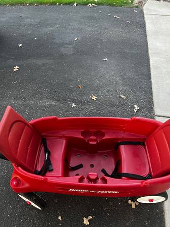 two seat red radio flyer wagon. Seats fold down and have safety belts. Excellent condition. Pick up in Crystal.
