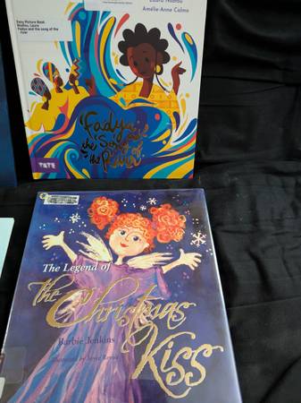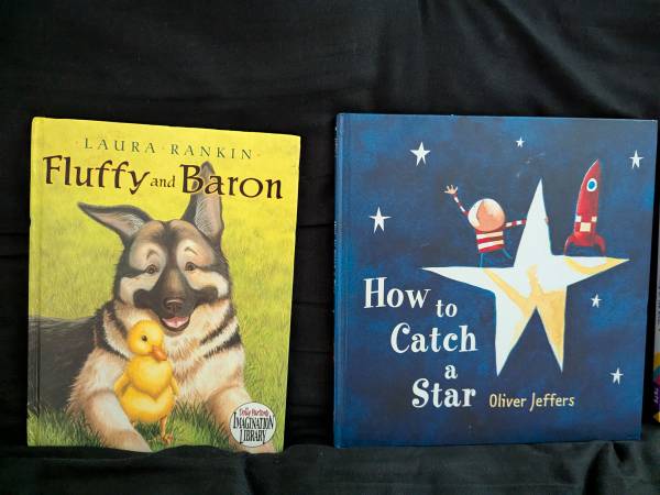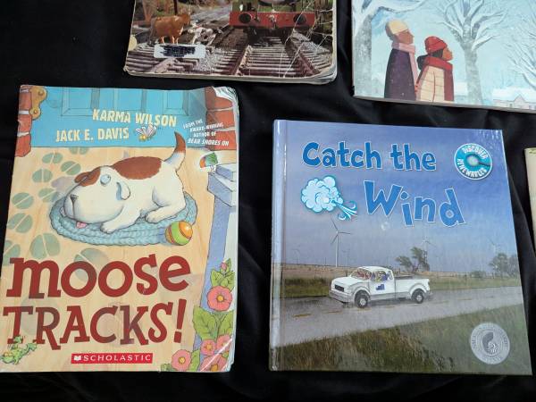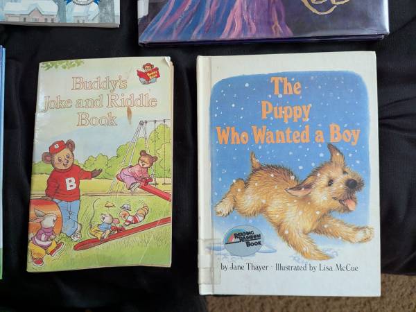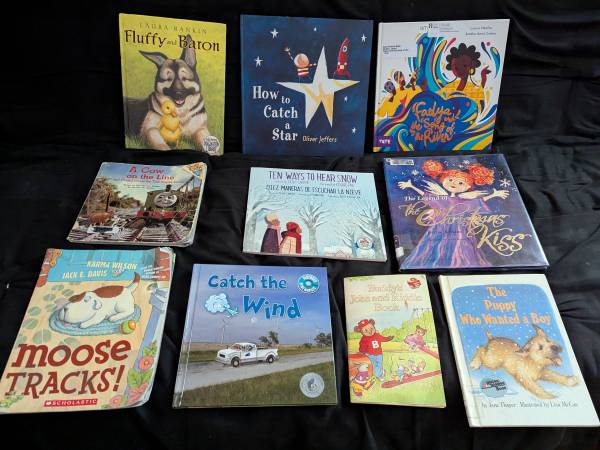 Children's books for older children. All 10 books for $10. These books have longer stories and more reading/words. Titles are: Fluffy and Baron, How to catch a star, Fadia and the song of the River, Thomas the train - a cow on the line and other Thomas the tank engine stories, Ten ways to hear snow, The legend of the Christmas kiss, Moose tracks, Catch the wind (a technical book about wind energy), Buddy's joke and riddle book, The puppy who wanted a boy. Most of the books are in good to excellent condition, except the Thomas the tank engine book - the cover is very wrinkled and worn but the inside pages are still in good condition. Some of the books we got previously used. A few books have library stickers or other stickers.