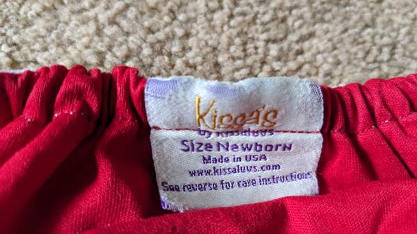 -One Kissa brand all-in-one style Newborn diaper (red, bottom right in first photo) no insert, just thick lining incorporated into cover)--in good condition (outer fabric, snaps, elastic all good). This is the smallest diaper in the lot, it is a true newborn size, although we were still able to use for many months.