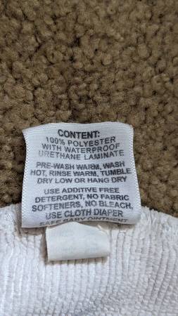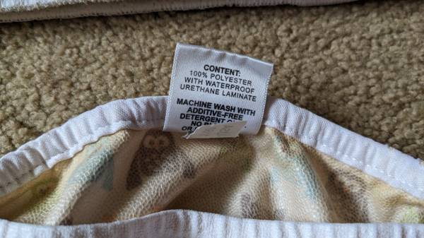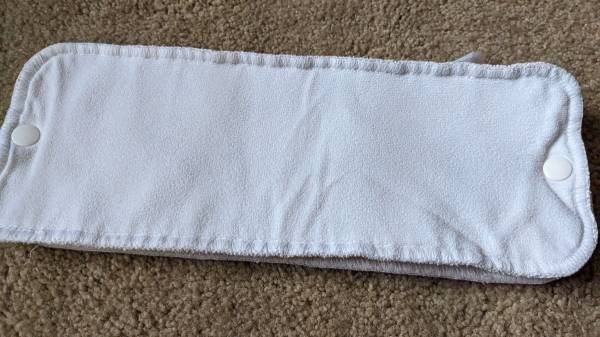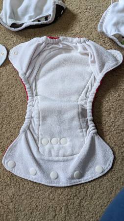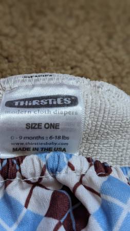 -Two Thirsties Size 1 original pocket style diapers (cover with insert, the inserts are two pieces that snap button together)(top center and right in first photo). In good condition, the fabric and snaps are good, the elastic on these two is more worn but it was never a problem because these diapers have leg gussets (extra fabric around legs for better fit). Size 1 = zero to 9 months, but we were able to use through 18 months (depending on size/build of your child)
