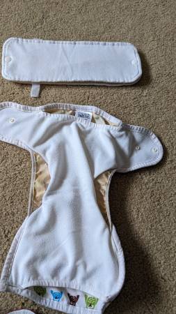 -One Thirsties all-in-one style diaper (owl print, top left in first photo) has one thick insert that is attached to the diaper at one end (easiest for laundry! No need to stuff inserts into diapers)--in good condition (outer fabric, snaps, elastic all good). This is a actually a one-size diaper (for various ages)