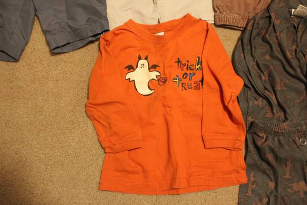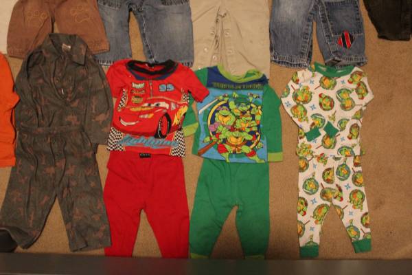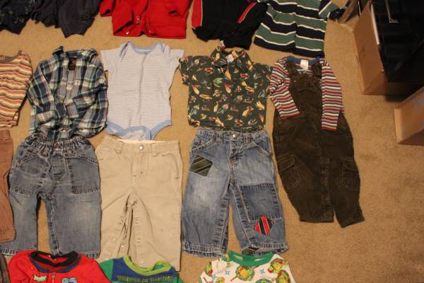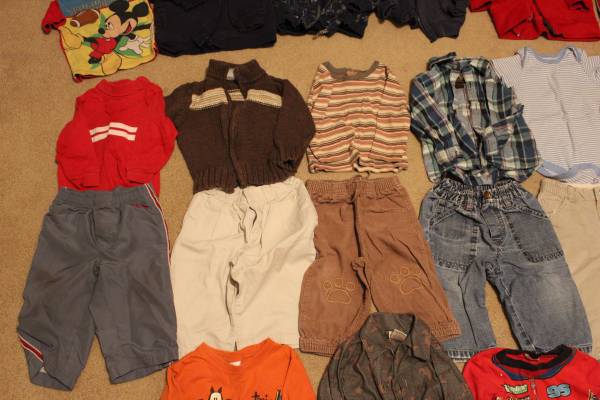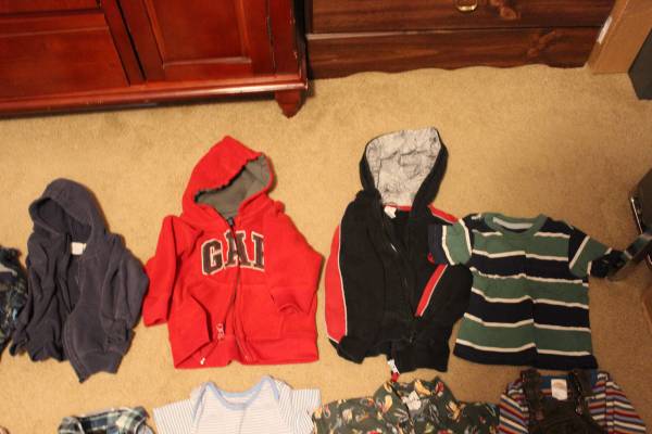 Baby clothes size 12 months. Includes 7 shirt and pants outfits, 5 sweatshirts, 2 T-shirts, 1 longsleeved Halloween shirt, 4 pairs of pajamas. Plus bonus item Cars cap (tag says size Toddler). Tags are for 12 months and 12-18 months. Due to variability in clothing sizes, some may likely fit at 9-12 months. Most items are in good condition. There may be a few small stains. Smoke-free and pet-free home. These were used for boy clothes although some are gender neutral.