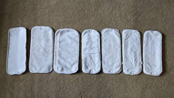 Extra inserts for cloth diapers, five of them are Thirsties brand all-in-two inserts (2 pieces that snap together), one single one (second from left) is Bum genius, last one (third from left) is two inserts layered together (but they don't snap together). Can be used in any liner or pocket type diaper to replace an insert or add an insert for more absorption.