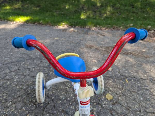 Fisher Price Little People boys and girls tricycle, paint is a little worn on handlebars (see photo), otherwise in good condition.