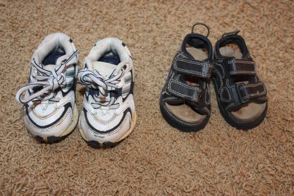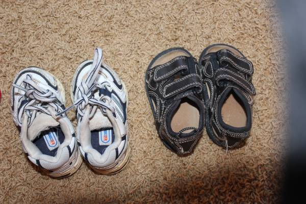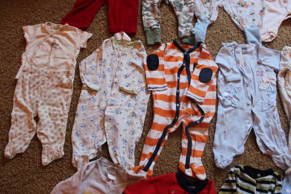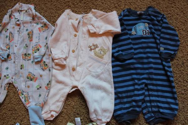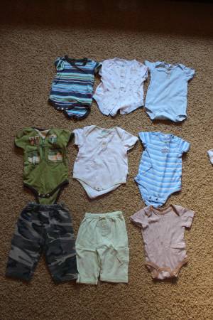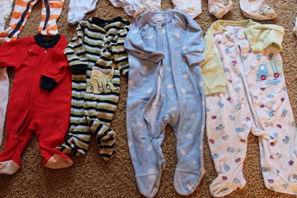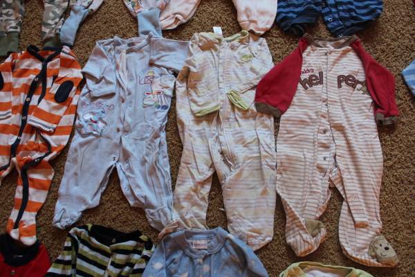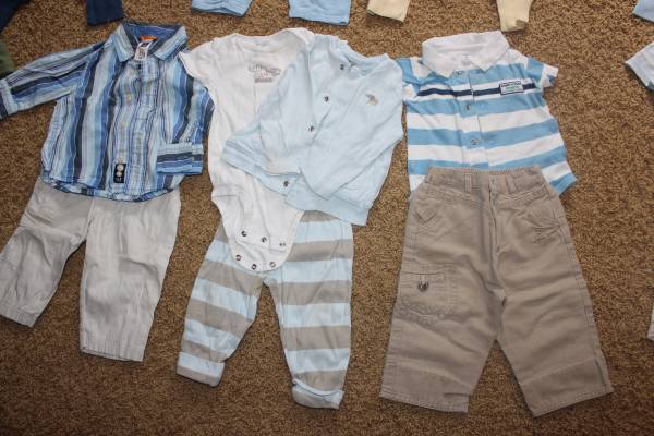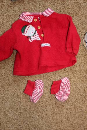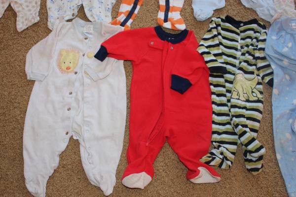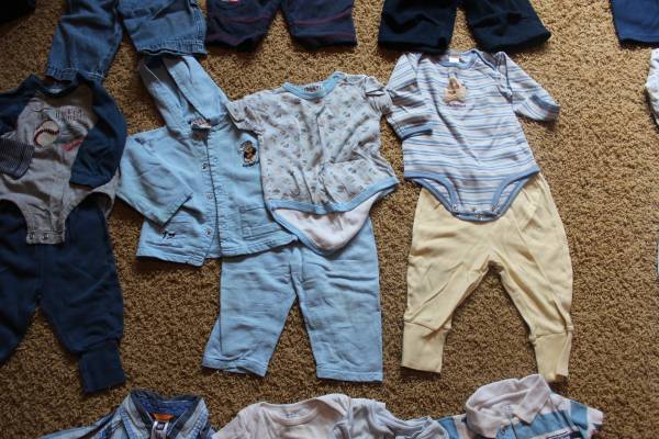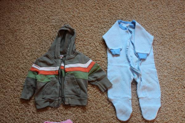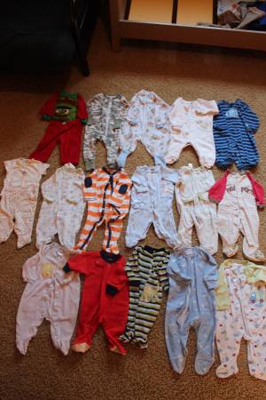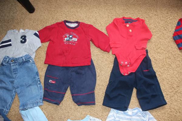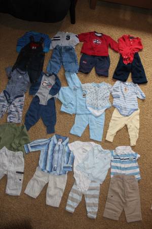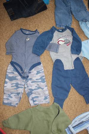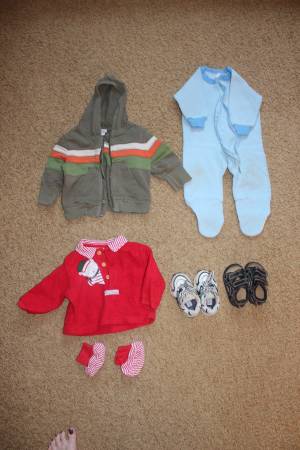 Fall/winter wardrobe for baby clothes size 6-9 months. Includes 16 sleepers, 8 shirt and pants outfits, and 7 onesies with 2 extra pants. Bonus items: shoes and sandals (baby size 4), sweatshirt, Christmas sweater and slippers set, and another sleeper. Tags are for 6 months, 6-9 months, 9 months and some say 6-12 months. Most items are in good condition. Some items may have small stains, tears, etc. Can look at everything before you buy. Lots of options! Smoke-free and pet-free home. These were used as boy clothes although some are gender neutral.
