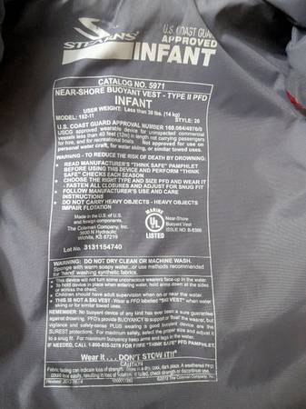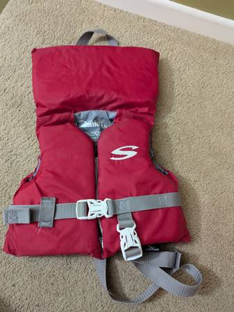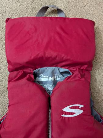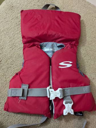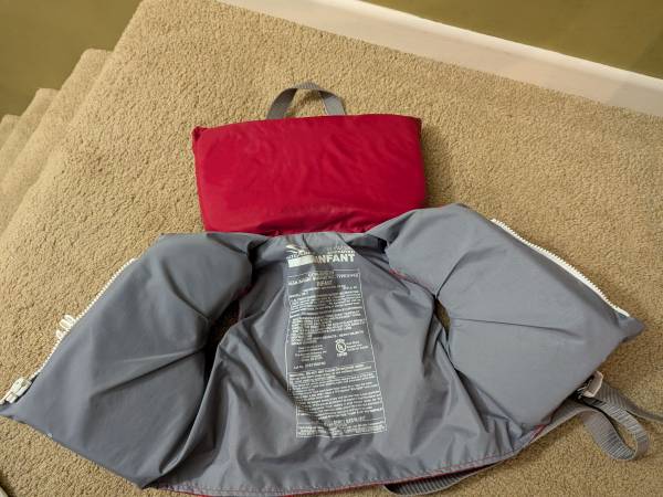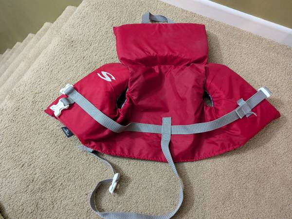 Stearns infant life jacket / baby life jacket for child weight up to 30 pounds. Red color. Excellent condition and all buckles/straps work. Smoke free and pet free home.