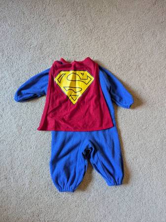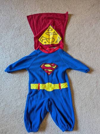 Superman baby Halloween costume. Tag says infant but both my kids wore it at age 4-6 months. Blue fleece material. Cape is removable and attached with Velcro. Good condition. Smoke-free and pet-free...
