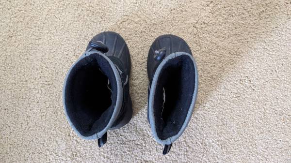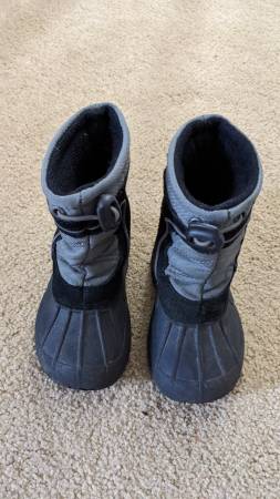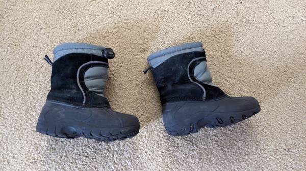 Toddler snow boots, size 5 (usually fits age 12-18 months), black and gray, excellent condition, good tread. Smoke free and pet free home.