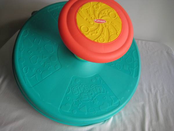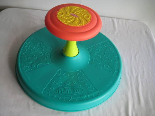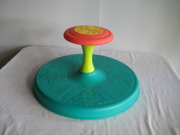 This is the classic Sit 'n Spin by Playskool. The toy spins around as the child sits on the base and holds onto the wheel. The child makes it spin using their muscles and motions, with some help from the design of the rotating base! The base pivots. Lots of fun!