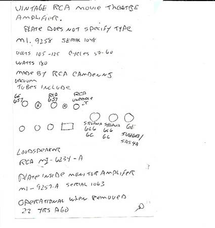 Electronics Amplifier Tube Equipment. RARE THEATRE PROJECTION Equipment. VINTAGE. Sold In (1) Lot. Tube equipment. RCA mi-9257 Amplifier Loudspeaker mi-6234-A Theatre Equipment. RCA WESTERN ELECTRIC SIMPLEX Plus other brands and misc. all used in the movie theatre. Equipment from small town movie theatre. Sold by original owner. 1950's Theatre Equipment. PLUS More. SOLD AS (1) LOT. RARE. QUALIFIED Buyers. ALL Sales Final. All Items Sold As Is.