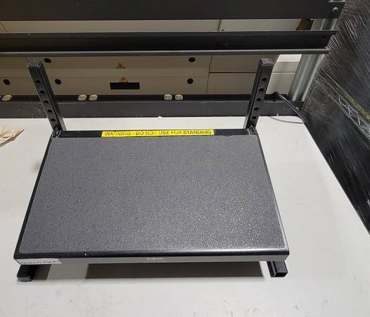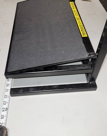 Features a fast and easy-to-use secure rack and pin height adjustment range from 3” to 11” in 1” increments, a 16-gauge steel platform with a non-skid surface tread and a 14-gauge steel tube frame with all joints welded. Black powder-coat finish on metal parts. Platform size is 20” wide x 11” deep with 10-degree slope."