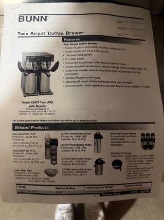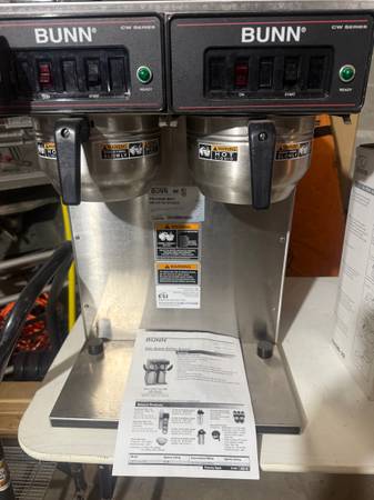 BUNN twin pot coffee brewer, for restaurant use. New $1200. 30 AMP. Used in bakery. Good condition.