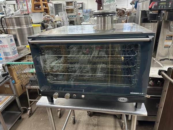 Equip your kitchen with the versatile cooking power of this Cadco Rossella 4-shelf full size heavy-duty manual countertop convection oven. This full size convection oven's advanced airflow design ensures even, consistent baking. It includes 4 wire shelves with 3" between each shelf for baking a variety of foods. Capable of holding 4 full size sheet pans (sold separately), this unit can also accommodate steam pans (sold separately). It features manual time and temperature controls and it boasts a temperature range of 175-500 degrees Fahrenheit for versatile use. It includes a 60 minute timer and continuous on feature, and it beeps at the end of a cycle. Plus, an LED light in the door allows you to conveniently monitor baking progress. This convection oven's compact design fits nicely onto countertops, making it perfect for cafes, delis, and pizza shops.