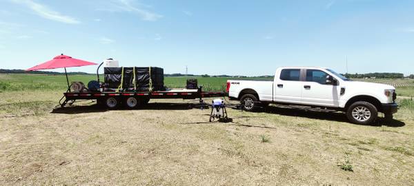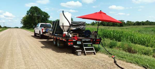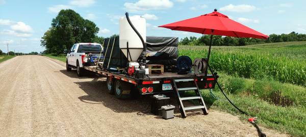 - 20 foot deck-over spray trailer (trailer is a 2025 Road Warrior dual axle 14k lb bumper pull with electric brakes) with 4-275gal IBC fresh water totes (covered in black billboard vinyl to avoid algae growth), a 110 gallon mix/inductor tank, one Westinghouse 11.5kW generator, one 2" banjo pump with Honda gas engine with electric start and hour meter, electric fresh water pump for washing/cleaning, Banjo 2" plumbing, custom flip-up stairs on rear of trailer, umbrella holder at rear of trailer. Two retractable hose reels - one 1" for filling the drone and one 3/4" for washing up. Trailer is wired with a 240v and 120v outlet at the rear for convenience.
