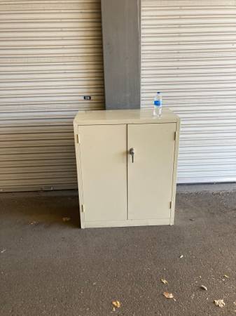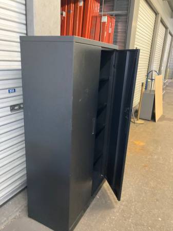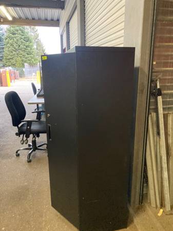 Commercial Quality Office/Shop/Home Supply Cabinet. Doors work well, adjustable shelves, clean. Sturdy. We have two available. Larger cabinet (black) $95. Smaller cabinet (white) $85. Happy to load...