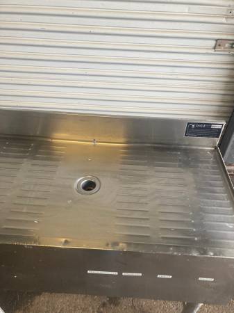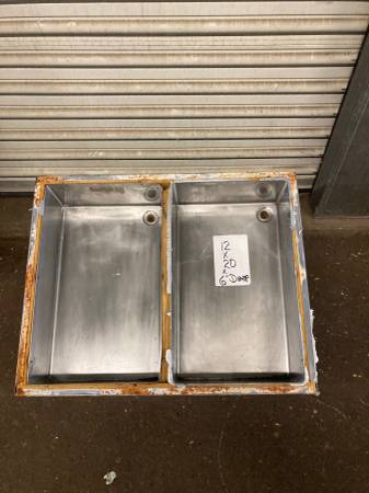 FOOD SERVICE GRADE (NSF) surplus stainless steel items (Fourteen various items) clean, undamaged, excellent condition. Small sink, several sink/tubs with drains (Great for table top beverages on ice for parties). Various shelves (heavy duty) counter tops, sheets, Priced $55 (shelves) and $95 for sink with legs, counter top ss sheet, ss cart. Happy to load up all customers.
