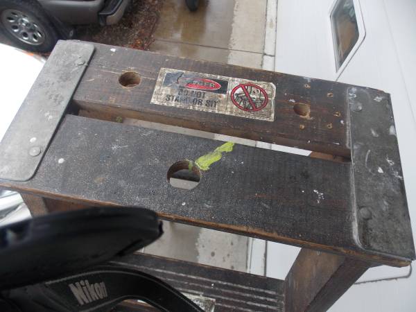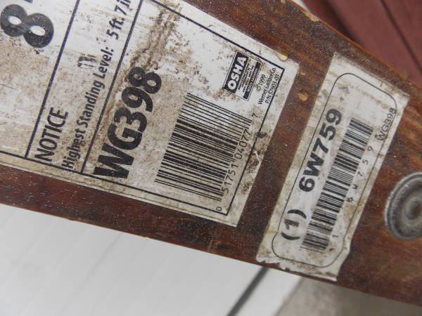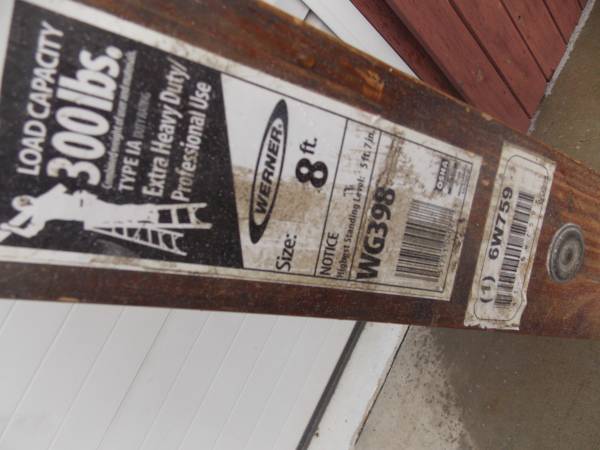 Werner WG398 Step Ladder 8' Tall Wood 300 Lb Capacity Very Ridgid. This baby is the real deal. Very strong and Rigid with 300Lb weight Load Capacity. It has all 4 of the steel factory foot Pads in place properly and all the rungs feel to be strong and Tight. Call (952)854-5 seven eight six