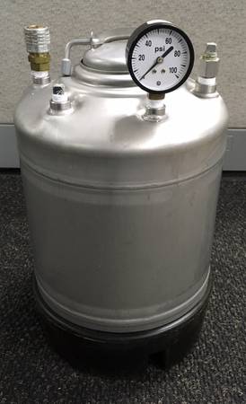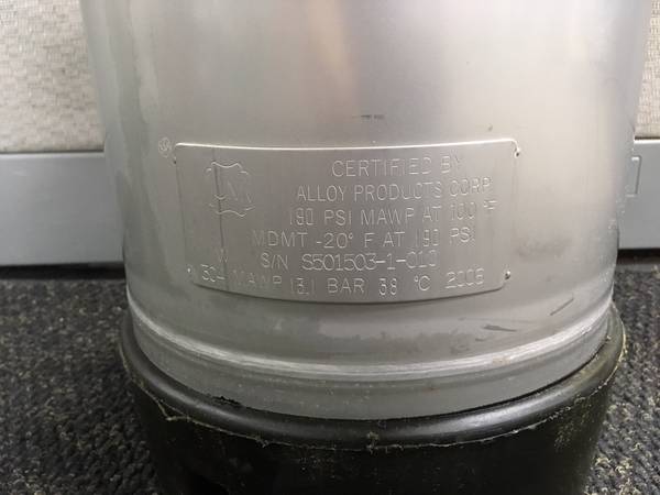 ALLOY PRODUCTS CORP., 3 GALLON PRESSURE VESSEL / KETTLE / CANISTER / TANK,190 PSI MAWP AT 100F,MDMT -20F AT 190 PSI,W SN S501503-1-010,304 MAWP 13.1 BAR 38C 2006 MCID 72817 root beer root-beer...