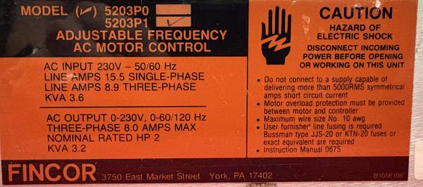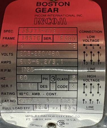 BALDOR INCOM BOSTON KUTF-3 GENERAL PURPOSE MOTOR 2-HP 1725 RPM 3PH 208-230/460V 145TC FRAME 60Hz MOTOR W/ FINCOR 5200 5203P1 AC MOTOR CONTROL ADJUSTABLE FREQUENCY,SHAFT DIAMETER 0.6250",ITEM IS USED
