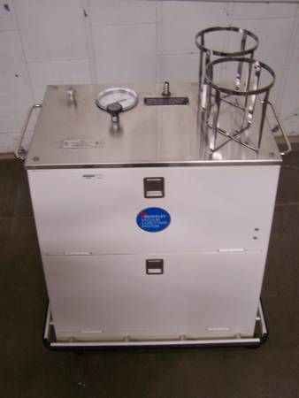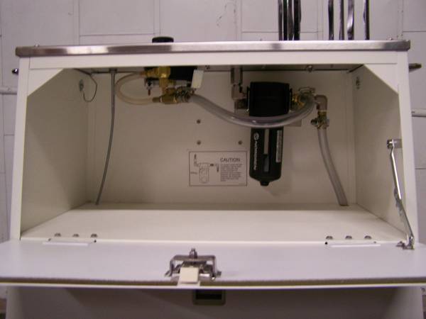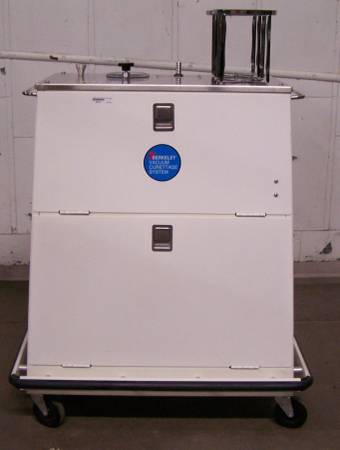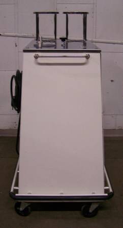 QTY 2 STAINLESS STEEL CONTAINERS/HOLDERS ON TOP OFUNIT,CART WITH WHEELS INCLUDED,DOOR 1 OPENS TO EXPOSE THE FILTER TRAP & COULD BE USED FOR STORAGE,DOOR 2 OPENS TO EXPOSE MOTOR & PUMP