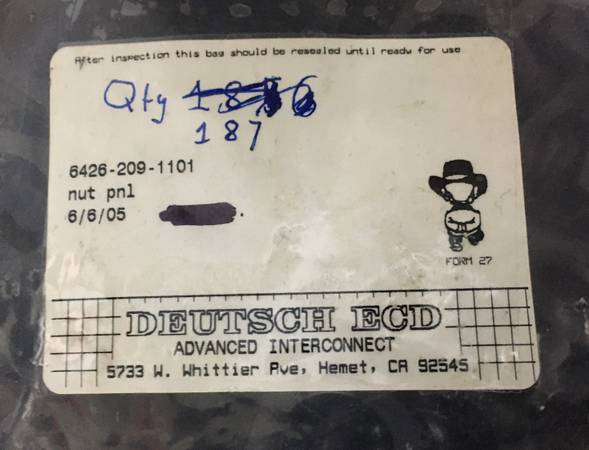 DEUTSCH ECD ADVANCED INTERCONNECT,6426-209-1101,NUT PNL ITEMS ARE NEW IN ORIGINAL PACKAGE,SELLING AS '1 PACKAGE CONTAINING 187 PCS.',YOU ARE PURCHASING ONLY WHAT IS PICTURED,PLEASE REVIEW PICTURES...