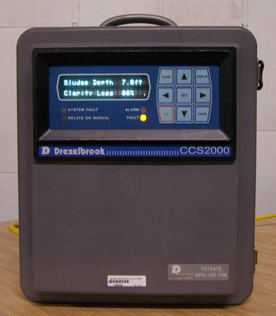 DREXELBROOK ENGINEERING COMPANY CCS 2000,SN 5079,CLARIFIER CONTROL SYSTEM,FLIP OPEN PANEL REVEALS CIRCUIT BOARDS & WIRING DIAGRAM,CLARITY LOSS SCALE FROM 1-100 INSIDE THE PANEL(PAPER SCALE),ON/OFF BUTTON,CARRY HANDLE,PLUGS IN AND WORKS