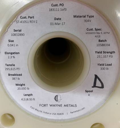 Fort Wayne Metals 304V Stainless Steel Size 0.041” ST-410S1 Net Weight 20lbs 25/.557 PSI, QTY 3 AVAILABLE SELLING INDIVIDUALLY @ $100.00 EACH ITEM IS USED, PLEASE REVIEW PICTURES OF LABEL CAREFULLY,...