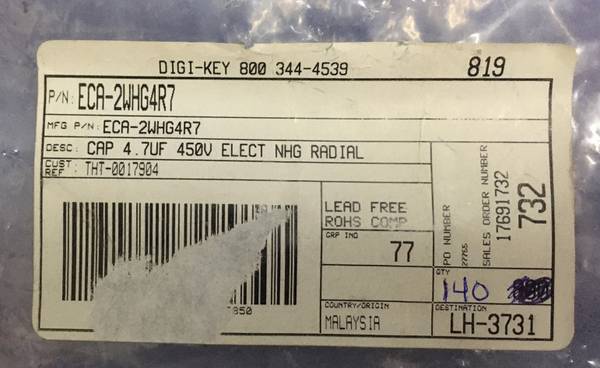 PANASONIC / DIGI-KEY ECA-2WHG4R7,ELECTROLYTIC CAPACITOR,CAP 4.7UF 450V ELECT NHG RADIAL ITEMS ARE NEW,SELLING AS '1 PACKAGE CONTAINING QTY OF 140 CAPACITORS',PLEASE REVIEW PICTURES CAREFULLY MCID...