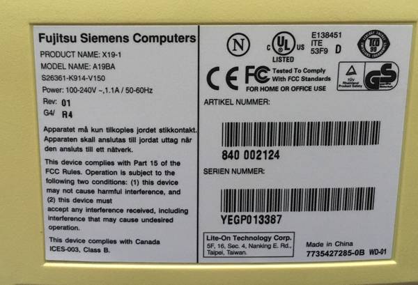 FUJITSU COMPUTERS SIEMENS X19-1,MODEL A197A,LCD MONITOR 19" ,S26361-K914-V150,110-240V,1.1A,50/60HZ,REV1 G4 R4, MINOR SCRATCH ON SCREEN ITEM IS USED, PLEASE REVIEW PICTURES CAREFULLY MCID 54486...