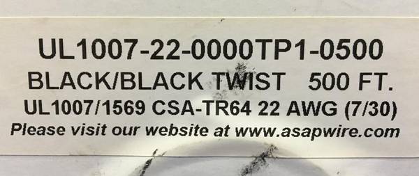 UL1007-22-0000TP1-0500. Color Black/Black Twist. New Wire.