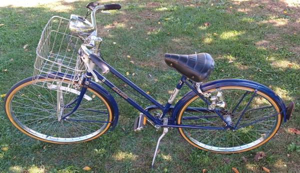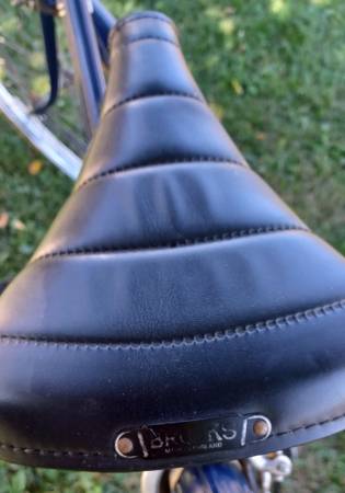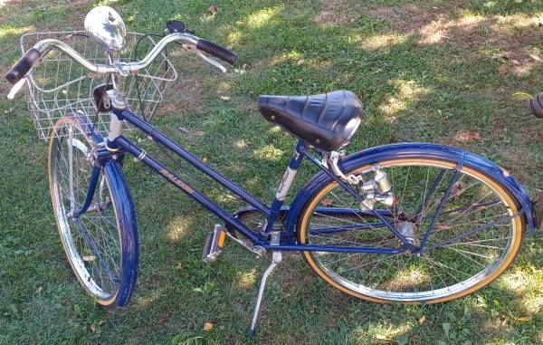 Bike is in good shape, but sat for many years and no doubt could use a tune up. I believe it is all original. Had an English made Brooks seat. I think the bike may be a 3-speed. It is blue. That is all I know. Come have a look. Note that we are in Albert Lea.