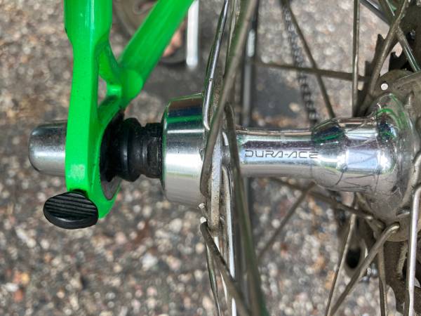 Components include complete Dura Ace drivetrain including chain, Dura Ace brakes and original pads, Mavic headset, Mavic bullhorn time trial bars, Cinelli stem, Dura Ace hubs laced with Hoshi bladed spikes to Matrix aero rims.