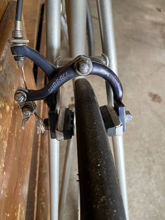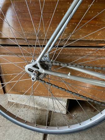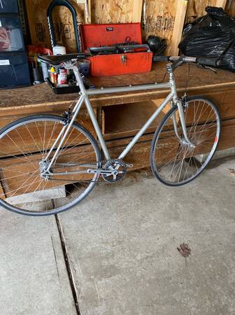 Unique 2 speed road or paved trail bike. Also could prolly fit bigger tires on. Frame is a steel touring type. Campy record head set and Campy drop outs on rear of frame.Cranks and brakes are old school Shimano Dura Ace. There is 2 front chain rings and adjustable rear drop out to change gears. Flat bars. I believe the frame is a 53cm.
