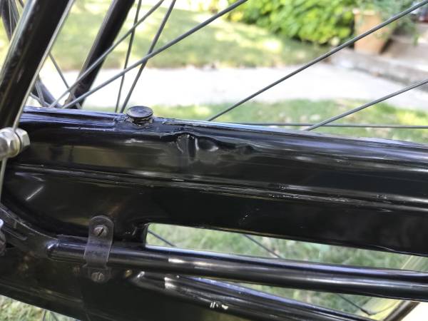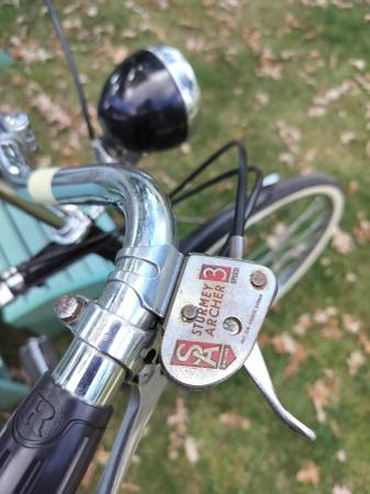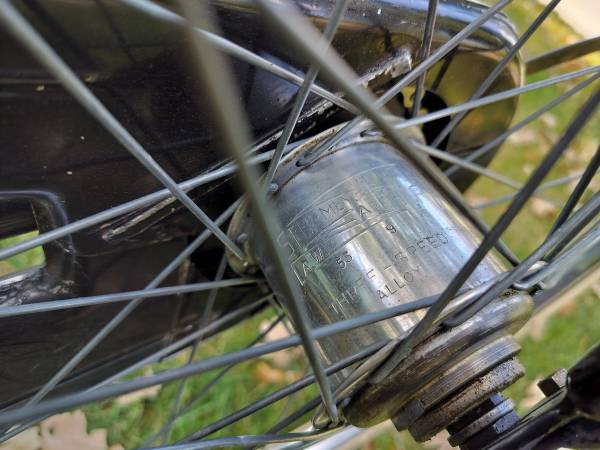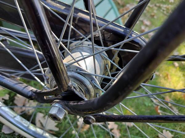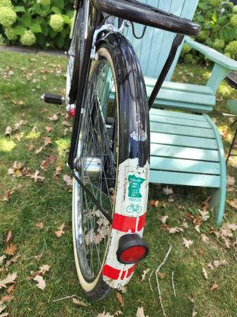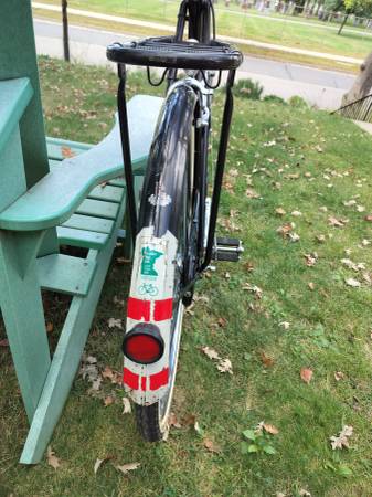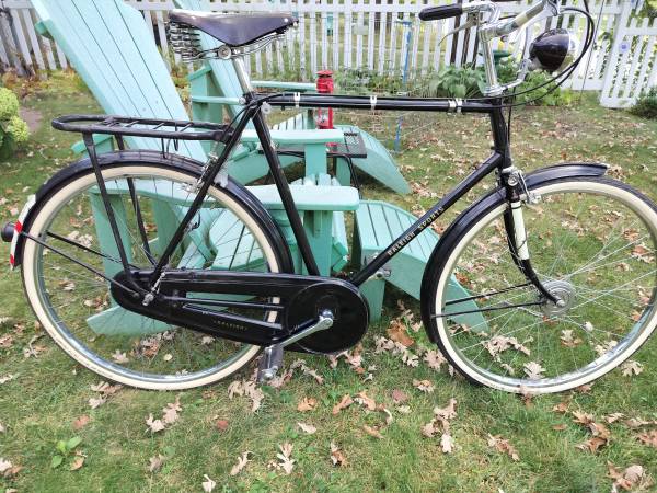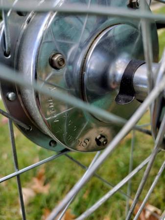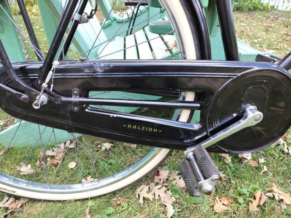 1953 Raleigh Sports for sale. I measured between the center of the crank spindle and the tip of the seat tube and it is 23" This bicycle has been completely overhauled (both front Dynohub and rear AW hubs, bottom bracket, head set and pedals were completely disassembled and rebuilt with fresh lubricant). The both wheels were rebuilt with old Raleigh spokes and this bicycle is ready to ride. The Dynohub generates power to illuminate both front and tail light (light bulbs are replaced with LED bulbs). It has used Brooks B66 saddles and Brooks carrier rack. The enclosed chain case has some dents, but the frame is in very good condition. The rear 3 speed hub is alloy shell (completely disassembled and rebuilt with fresh lubricant). The chain case is missing the sliding plates which goes around the rear hub (last picture). The 3 speed hub shifts well. The tires are almost new and 26 x 1 3/8 tires. Cash only please. Thank you.