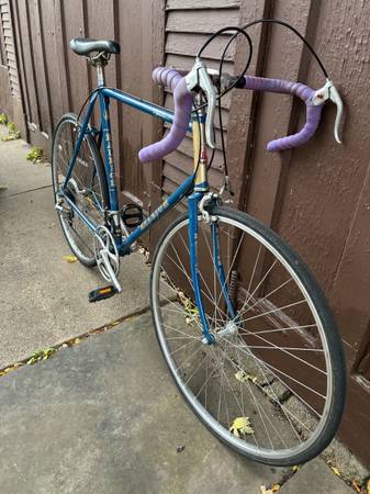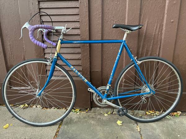 This is a 59cm (c-c) chromoly lugged steel Raleigh road bike. Everything is tuned and in good working order (new tires, new chain, new freewheel, new brake pads, newish bar tape). Perfect A to B transportation; rides great. The standover height is 33" and is designed for a person around 6'. The frame has horizontal rear wheel drops for an easy single speed conversion.