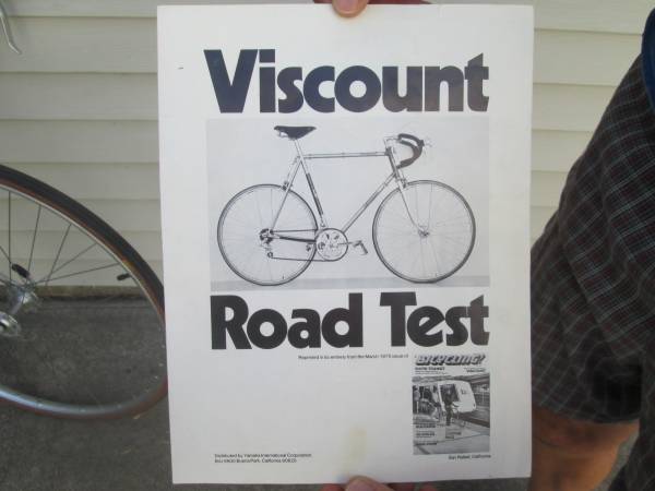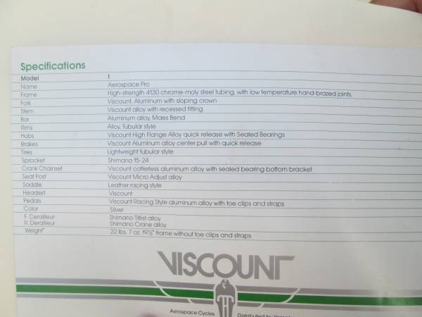 Collectable Retro rare made in England Lightweight Viscount Aerospace Pro Road bike that has been fully cleaned, lubed, tuned with wheels trued. Really a nice example of the period, known for their light weight, well built, nice ride. Comes complete with the famous aluminum "death fork", this appears to have the 3rd generation fork that some say were safe to ride with but do your own research. (If you're going to ride the bike hard you may want to upgrade the front fork).